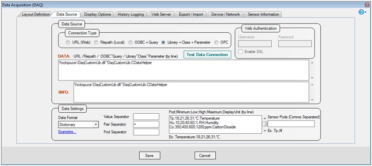 According to connection type. web address, filepath, odbc (connectionstring^query), or library^clas^parameter. NOTE: More than one items of data sources (ex: URLs) can be separated by line. The DATA strings are used for data collection, and INFO strings are used to get sensor information and configuration of devices. Both can be same. |