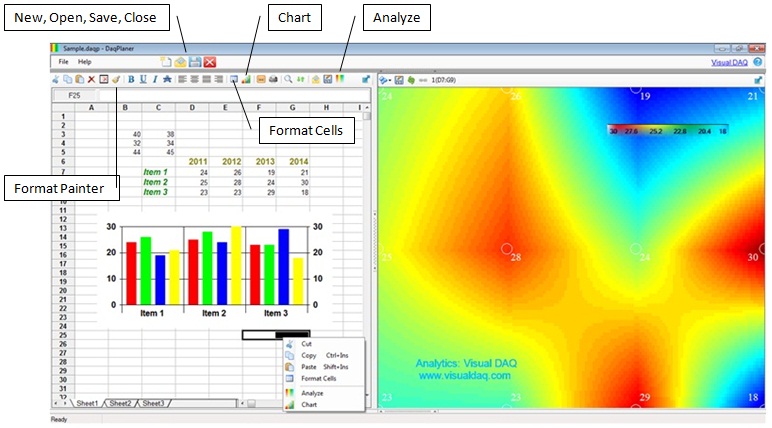 Main screen has icons to create/open and save DaqPlaner documents.