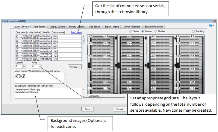 Unique names or serial numbers of the sensors, one each per line. The items will be automatically layout (row-wise from left to right), according to the matrix size. You can give custom names (often short, location names) after a semi-colon(;). Also, you can opt to display serial/custom name/seq.no. The selected option will be displayed in the spreadsheet, on data collection. Data Items box behaves like a multi-line textbox (similar to notepad). You can cut and paste lines of text (ignoring the overlay-ed lines), wherever you want, to specify the order of sensors in the layout. Arrange the serials so that it reflects the actual physical positioning in the data center. From Library Link: You can automatically fetch the serial list, if you are using an extension (custom) library for the device (See Data Source tab). |
